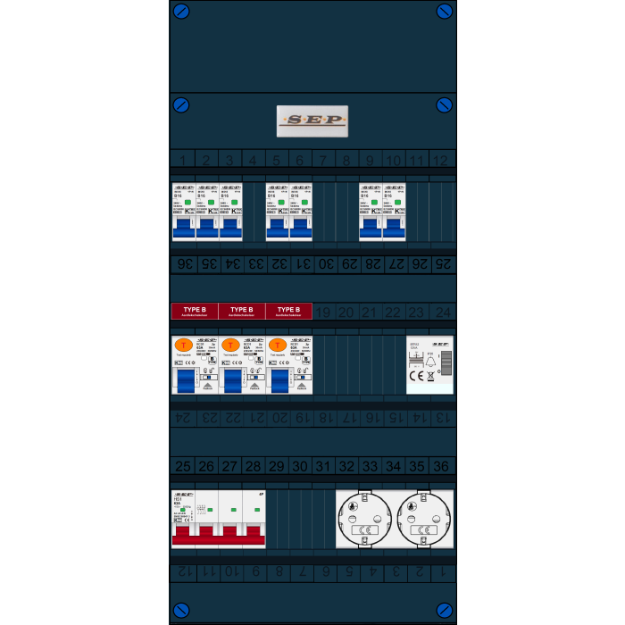 SEP FS groepenkast, hoofdschakelaar 4p/63A, 3x aardlekschakelaar 2p/63A/30mA (Type B), 7x installatieautomaat 1p+n/B16, beltrafo, tweevoudige contactdoos (3 fase)