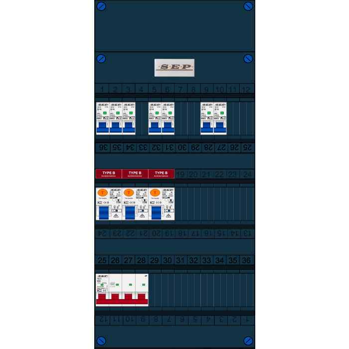 SEP FS groepenkast, hoofdschakelaar 4p/63A, 3x aardlekschakelaar 2p/63A/30mA (Type B), 7x installatieautomaat 1p+n/B16 (3 fase)