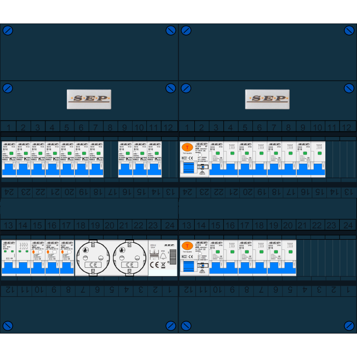 SEP groepenkast, hoofdschakelaar, 3x aardlekschakelaar 2p/40/30mA, 2x aardlekschakelaar 4p/40A/30mA, 10x installatieautomaat 1p+n/B16, 7x installatieautomaat 3p+n/B16, beltrafo, tweevoudige contactdoos (3 fase)