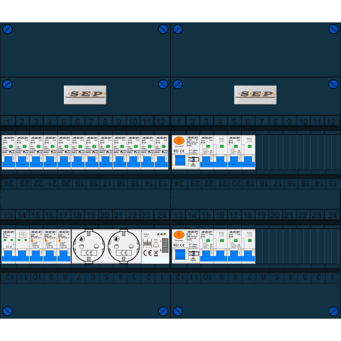 SEP groepenkast, hoofdschakelaar, 3x aardlekschakelaar 2p/40/30mA, 2x aardlekschakelaar 4p/40A/30mA, 12x installatieautomaat 1p+n/B16, 4x Installatieautomaat 3p+n/B16, beltrafo, tweevoudige contactdoos (3 fase)