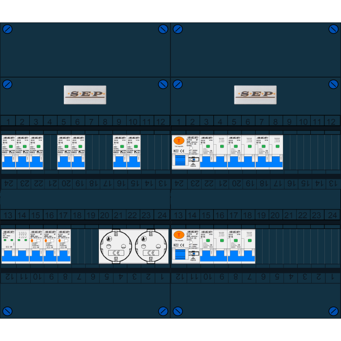 SEP groepenkast, hoofdschakelaar, 3x aardlekschakelaar 2p/40/30mA, 2x aardlekschakelaar 4p/40A/30mA, 7x installatieautomaat 1p+n/B16, 5x installatieautomaat 3p+n/B16, tweevoudige contactdoos (3 fase)