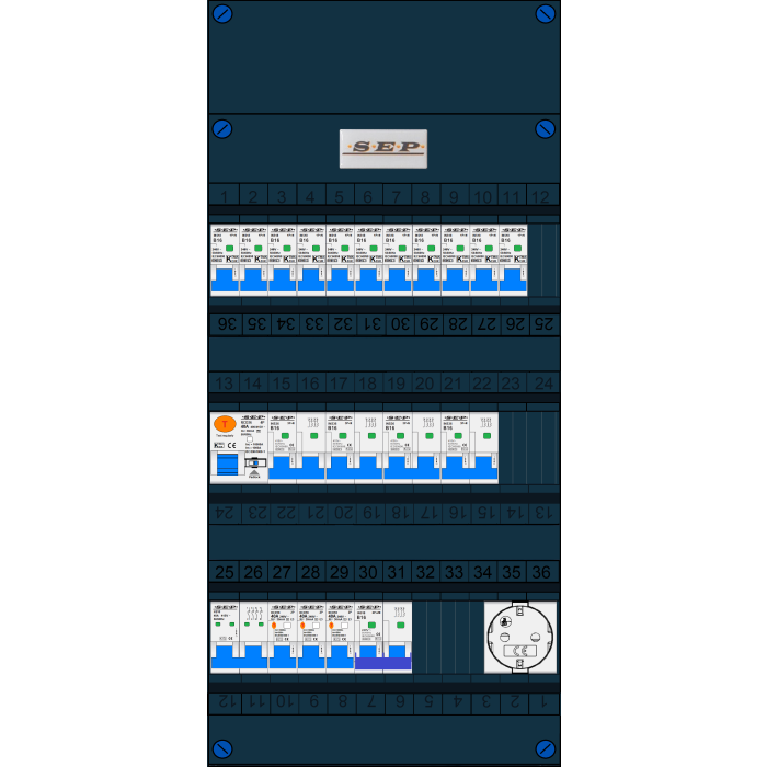 SEP groepenkast, hoofdschakelaar, 3x aardlekschakelaar 2p/40/30mA, 1x aardlekschakelaar 4p/40A/30mA, 11x installatieautomaat 1p+n/B16, 4x Installatieautomaat 3p+n/B16, kookgroep 2p+2n/B16, enkelvoudige contactdoos (3 fase)