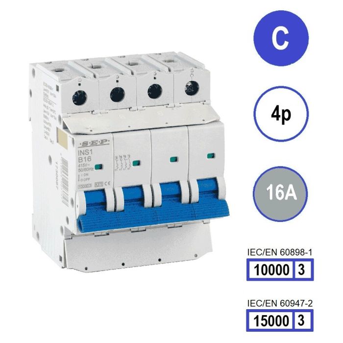 De SEP INS1-4C16 is een hoogwaardige installatieautomaat (MCB) ontworpen voor betrouwbare beveiliging van eindgroepen tegen overbelasting en kortsluiting. Deze uitvoering is 4-polig, met C-karakteristiek en een nominale stroom van 16A.