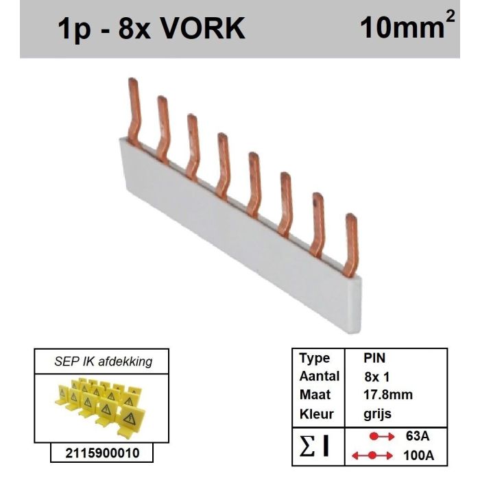 Geïsoleerde doorverbindingskam, 1 fase, 8x PIN, 10mm2, 17,8mm