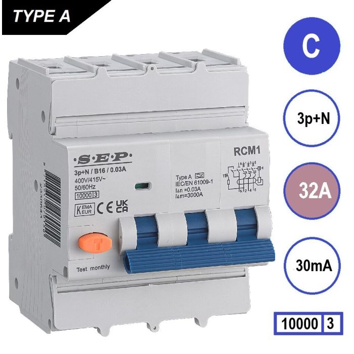 SEP RCM1 aardlekautomaat, 3p+n, C-karakteristiek, 32A, 30mA, 10kA, Type A