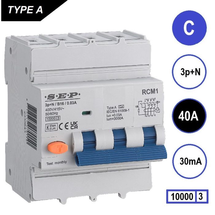 SEP RCM1 aardlekautomaat, 3p+n, C-karakteristiek, 40A, 30mA, 10kA, Type A
