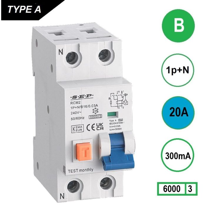 SEP RCM2 Aardlekautom. 1p+n B20 300mA 6kA