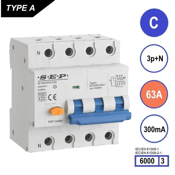 SEP RCM4 Aardlekautom. 3p+n, C63, 300mA, 6kA, Type A, (81mm)