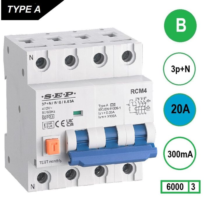 SEP RCM4 aardlekautomaat 3p+n, B, 20A, 300mA, 6kA