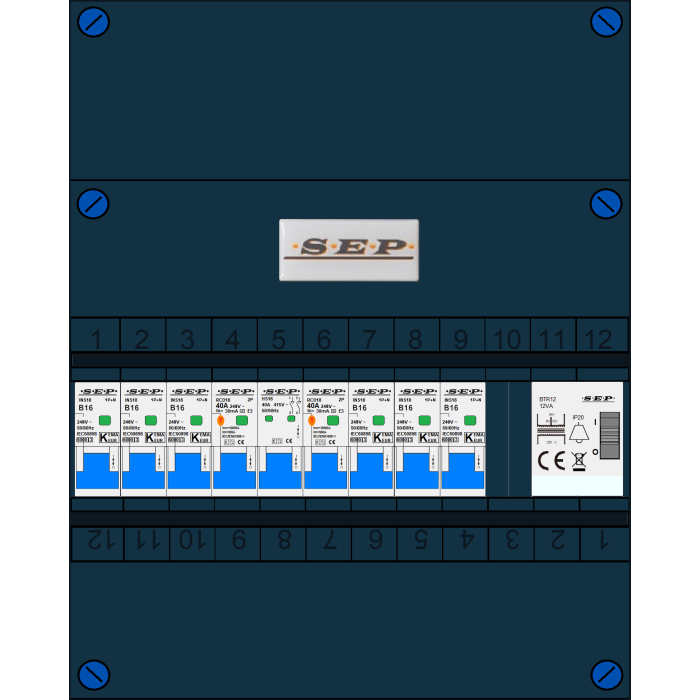 SEP groepenkast, hoofdschakelaar, 2x aardlekschakelaar, 6x installatieautomaat, beltrafo (1 fase)