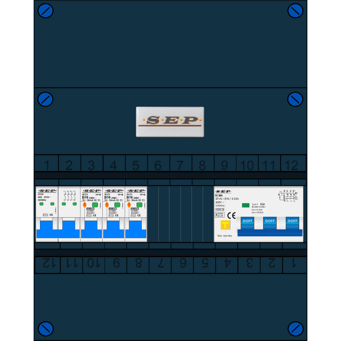 SEP groepenkast, hoofdschakelaar, 3x aardlekautomaat, kracht-aardlekautomaat (3 fase)